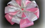 Чтобы изготовить нежный аксессуар, надо взять несколько сантиметров атласной ленты, кусочек фатина, швейные принадлежности. Ленту свернуть пополам и сшить, из фатина приготовить круглые элементы, и соединить их вместе, аккуратно стянув нить, придать форму цветка. В центр приклеить бусинку, и готовый экземпляр пришить к платьицу.